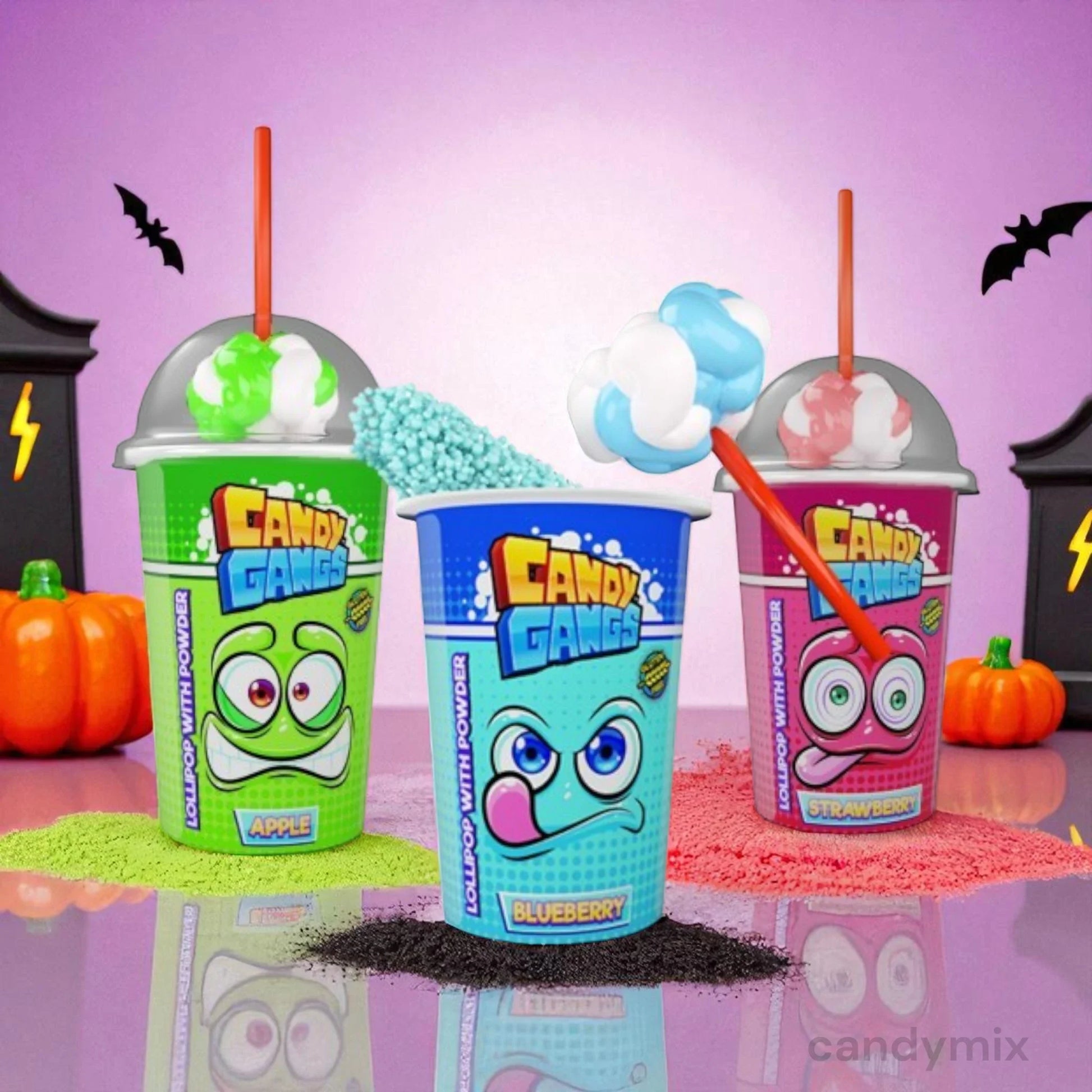 Each colorful cup contains a giant lollipop to dip into a tangy powder with an intense flavor. Available in several flavors (apple, strawberry, blueberry), these original candies offer a fun and tasty experience that appeals to children and adults alike.